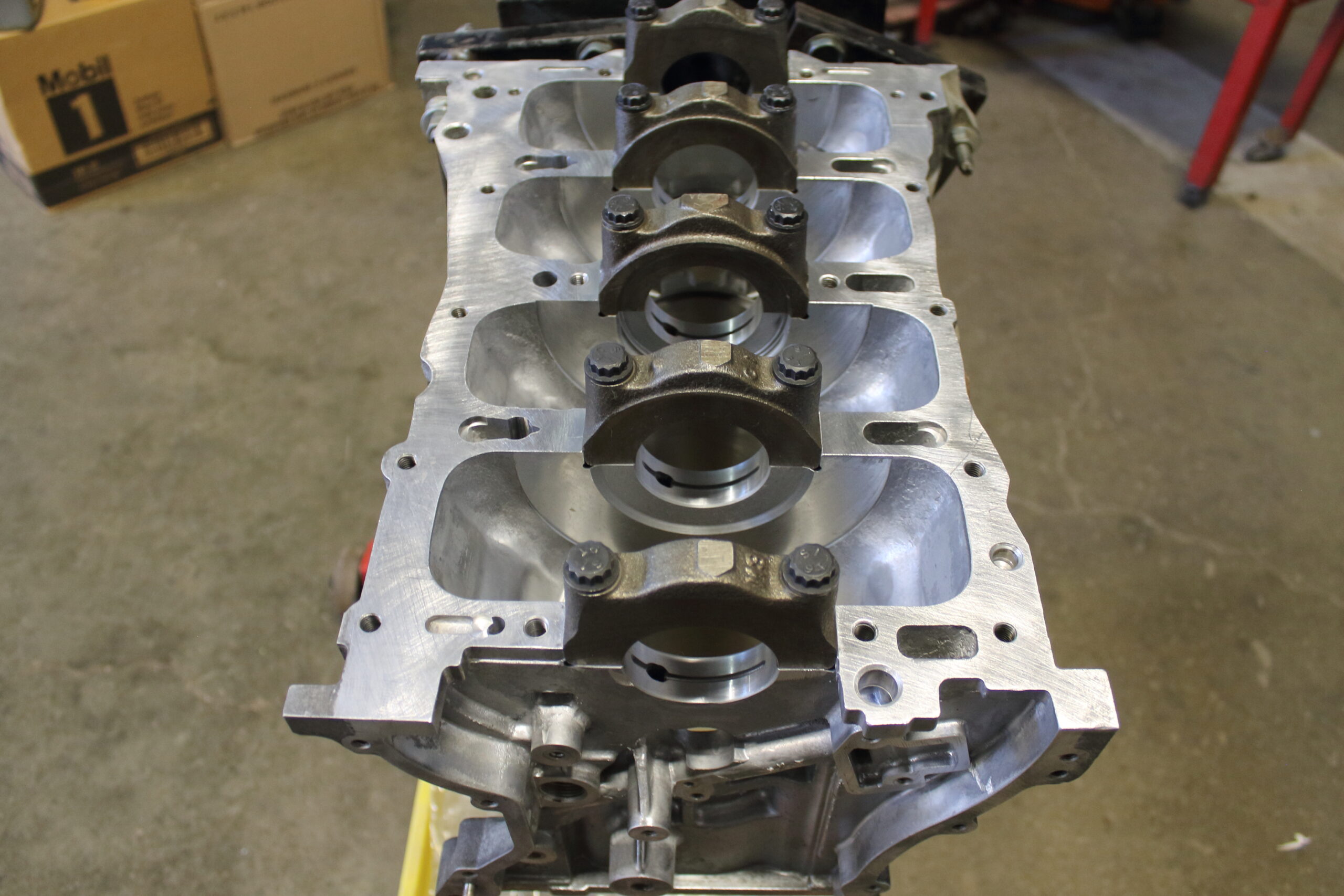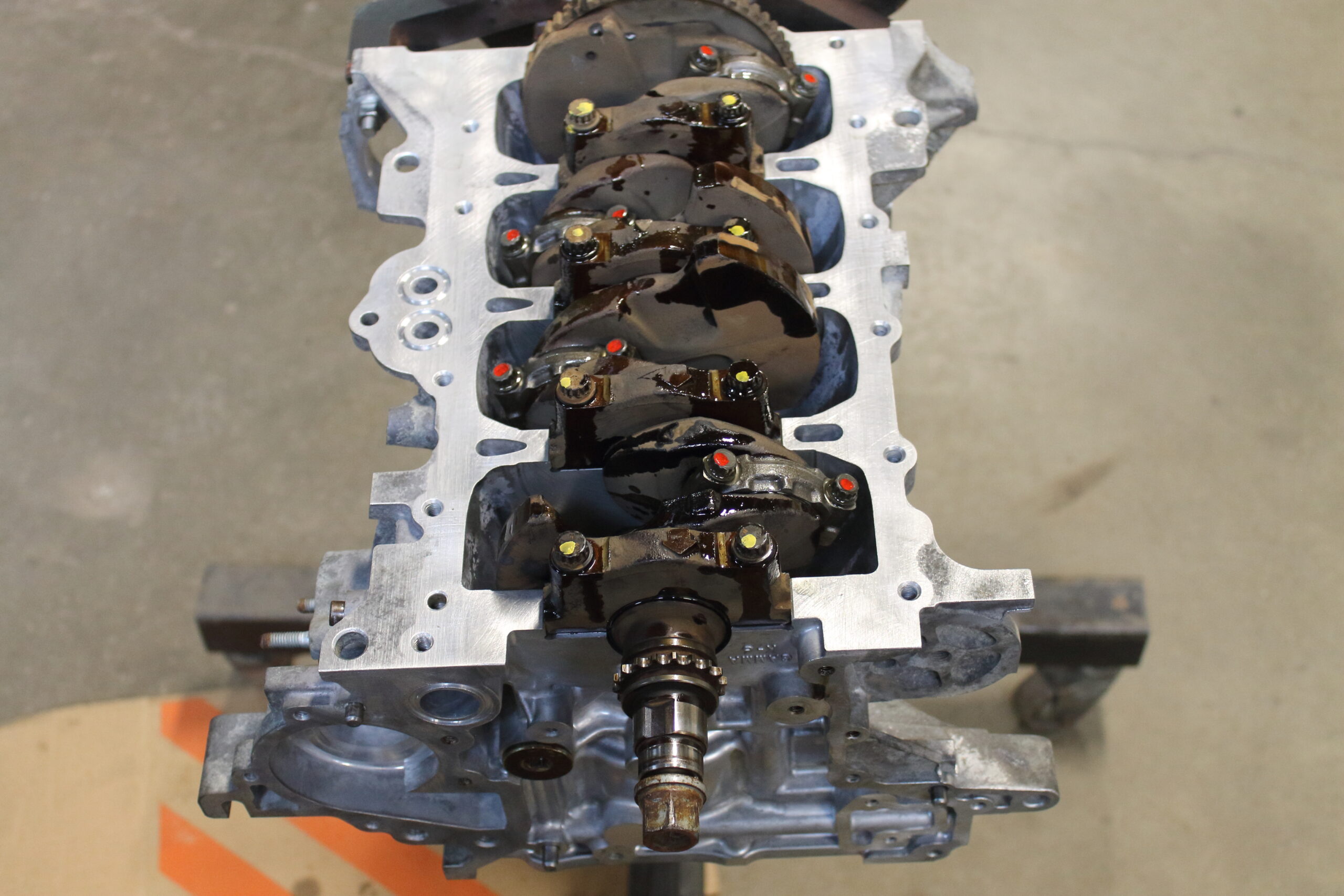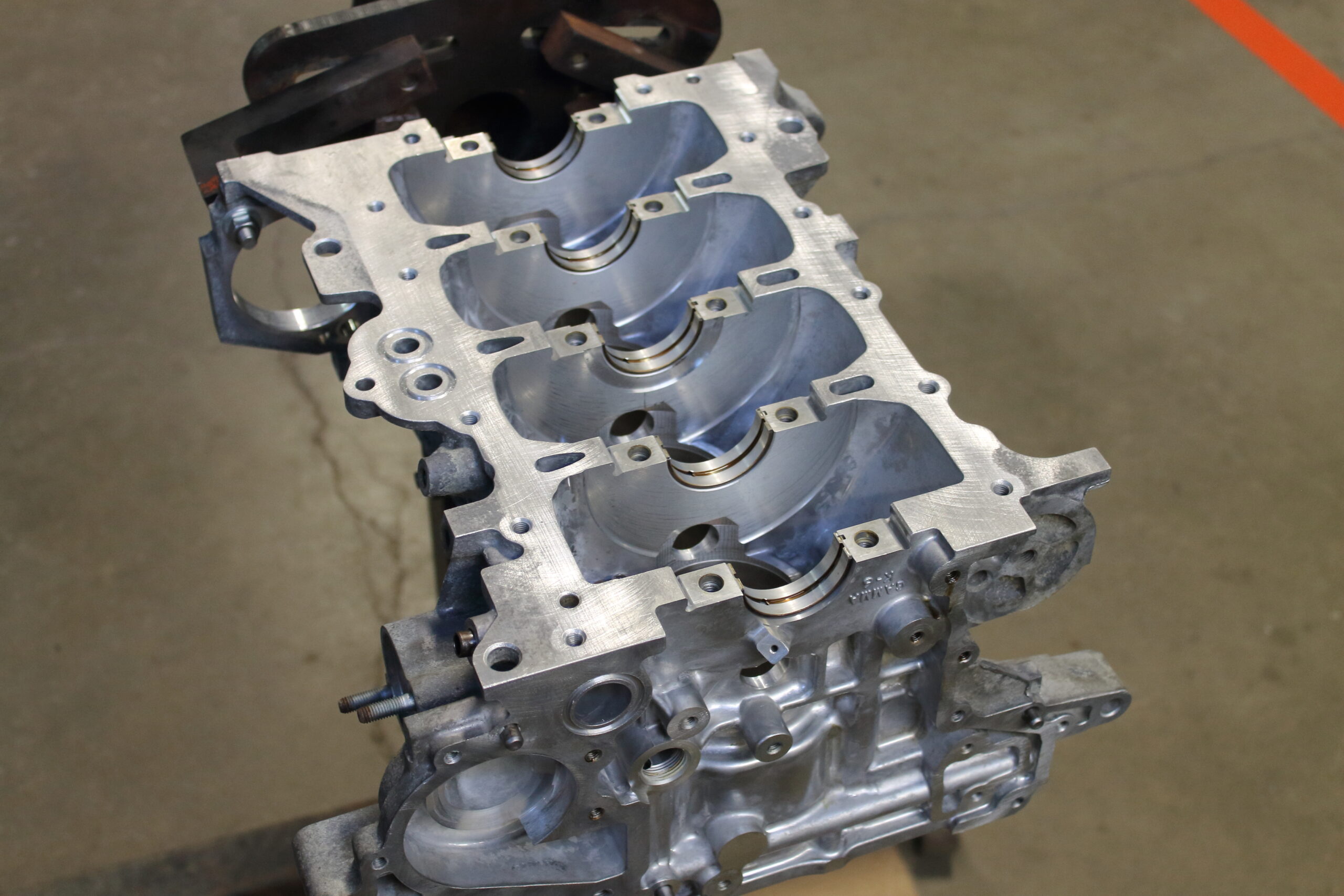 We went all out on this rebuild to handle the addition of a sizable turbocharger to this once naturally aspirated engine. First the engine block and cylinder head got the full machine shop treatment. Both the engine block and cylinder head got decked to ensure absolute trueness while removing as little as material as possible. To make sure the head gasket stays sealed tight under the higher cylinder pressure, we machined threaded inserts into the block deck and installed ARP head studs for maximum clamping force. We took it one step further and performed the same process to the main caps and had the bottom end of the block machined to accept threaded inserts for the ARP main stud kit.